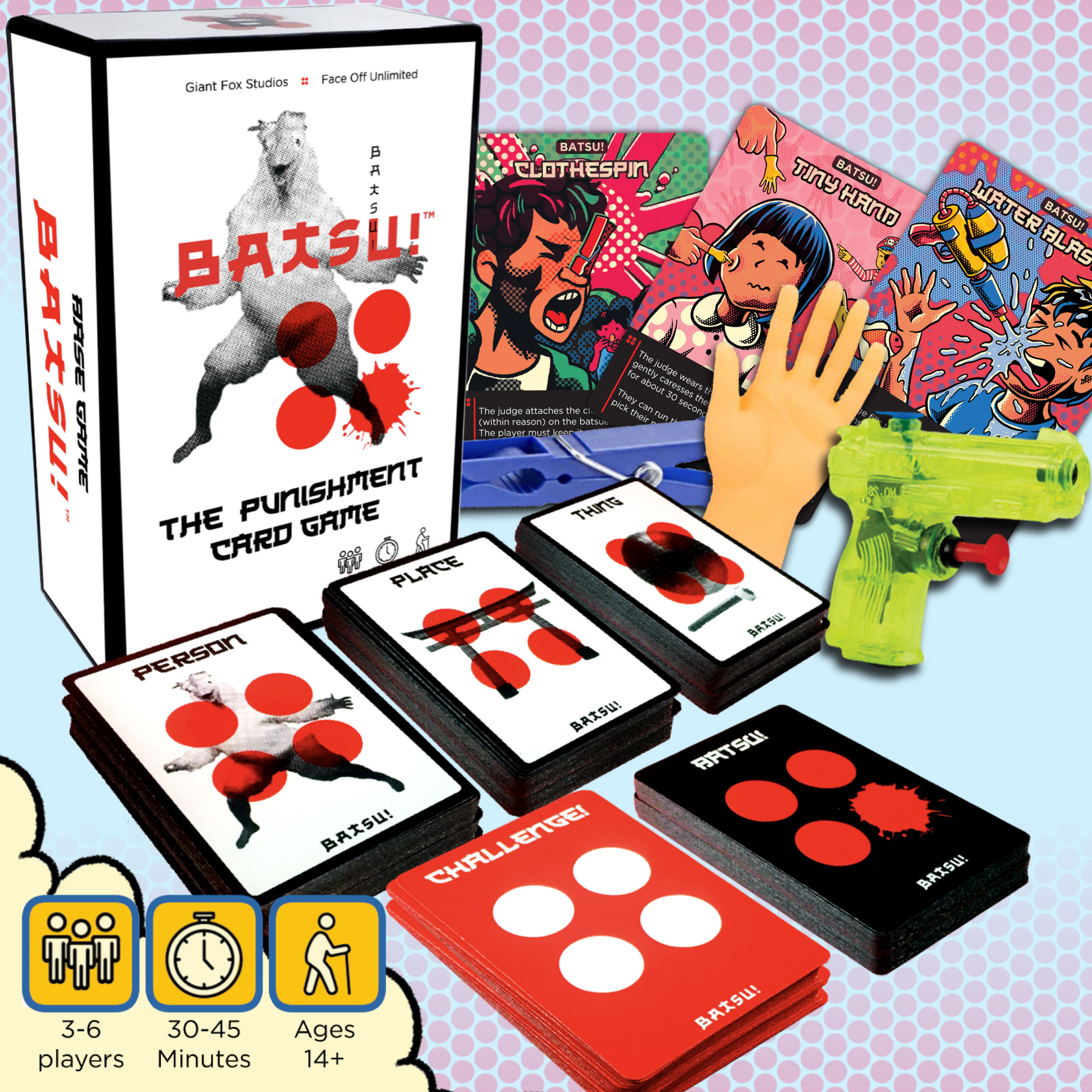 Introducing the Punishment Prop Cards! Pinch, squirt, and tiny-slap your way to laughter with three hilarious BATSU! punishments, each with its own physical prop!