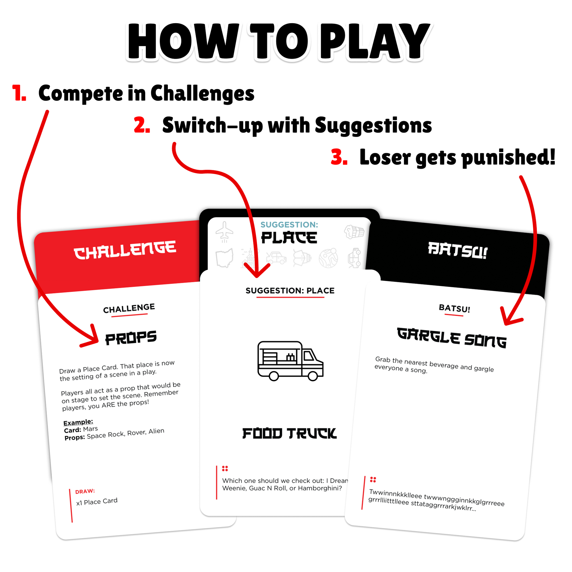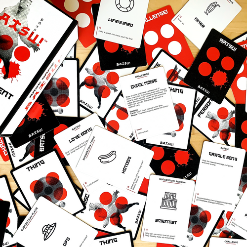 With over 20 challenges and over 90 suggestion cards in the base game alone, each round of BATSU! is unpredictable. You may rhyme about Ohio one round and then pretend to be an evil plumber dealing with budget cuts in the next!